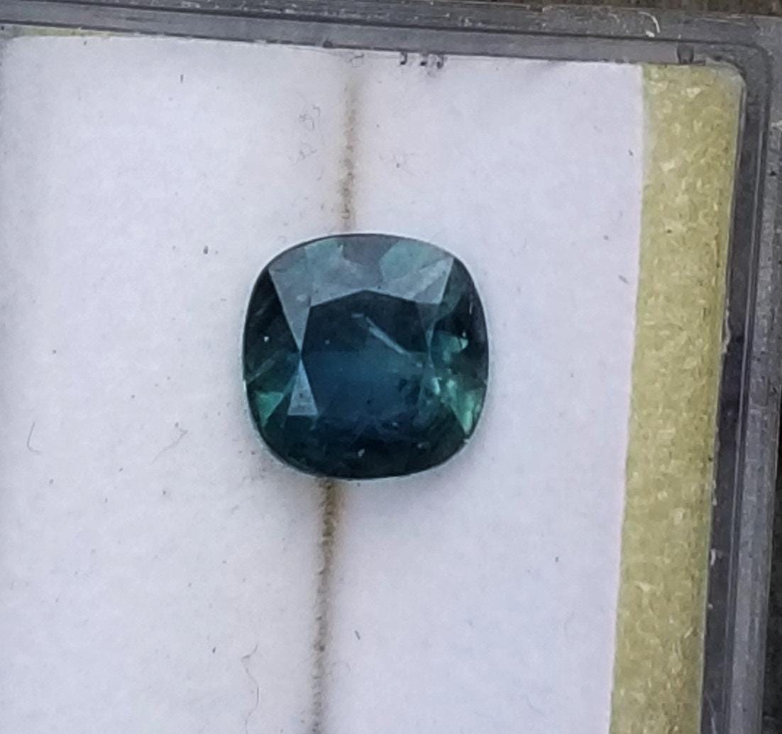 Blue green sapphire cushion shape September gemstone. size: 6.9mm cushion. weight: 1.40cts. clarity Some minor inclusions such as little line seeing in the photos.