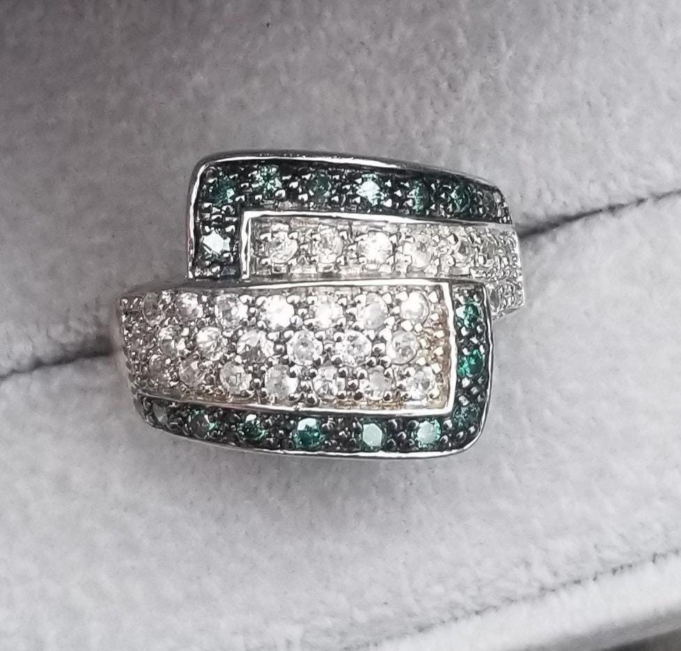 Unique Blue Green diamond sterling silver ring with accent stones white topaZ. ring size 7 US