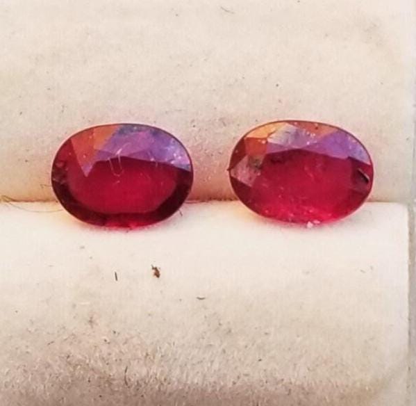 One of a king matching pair red ruby oval shape for custom jewelry earrings anniversary. Total weight: 1.50 cts. size: 6.6 x 4.8 mm oval. color : red. clarity: eye clean/ minor inclusions