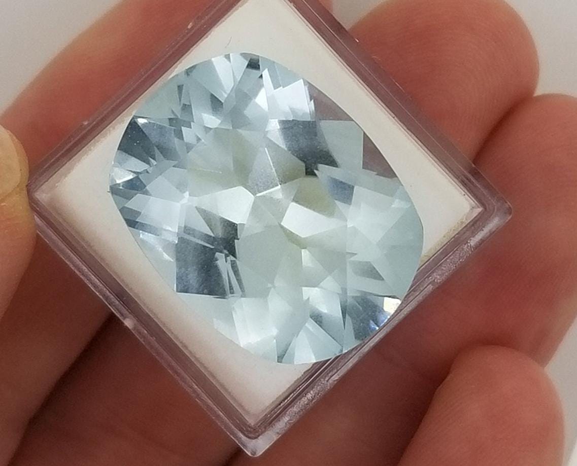 Natural, wholesale priced aquamarine cushion shape for jewellery. size: 21.3 x 16.3mm antique cushion. weight: 19.21 cts. color: sky blue. clarity: good. origin: Brazil