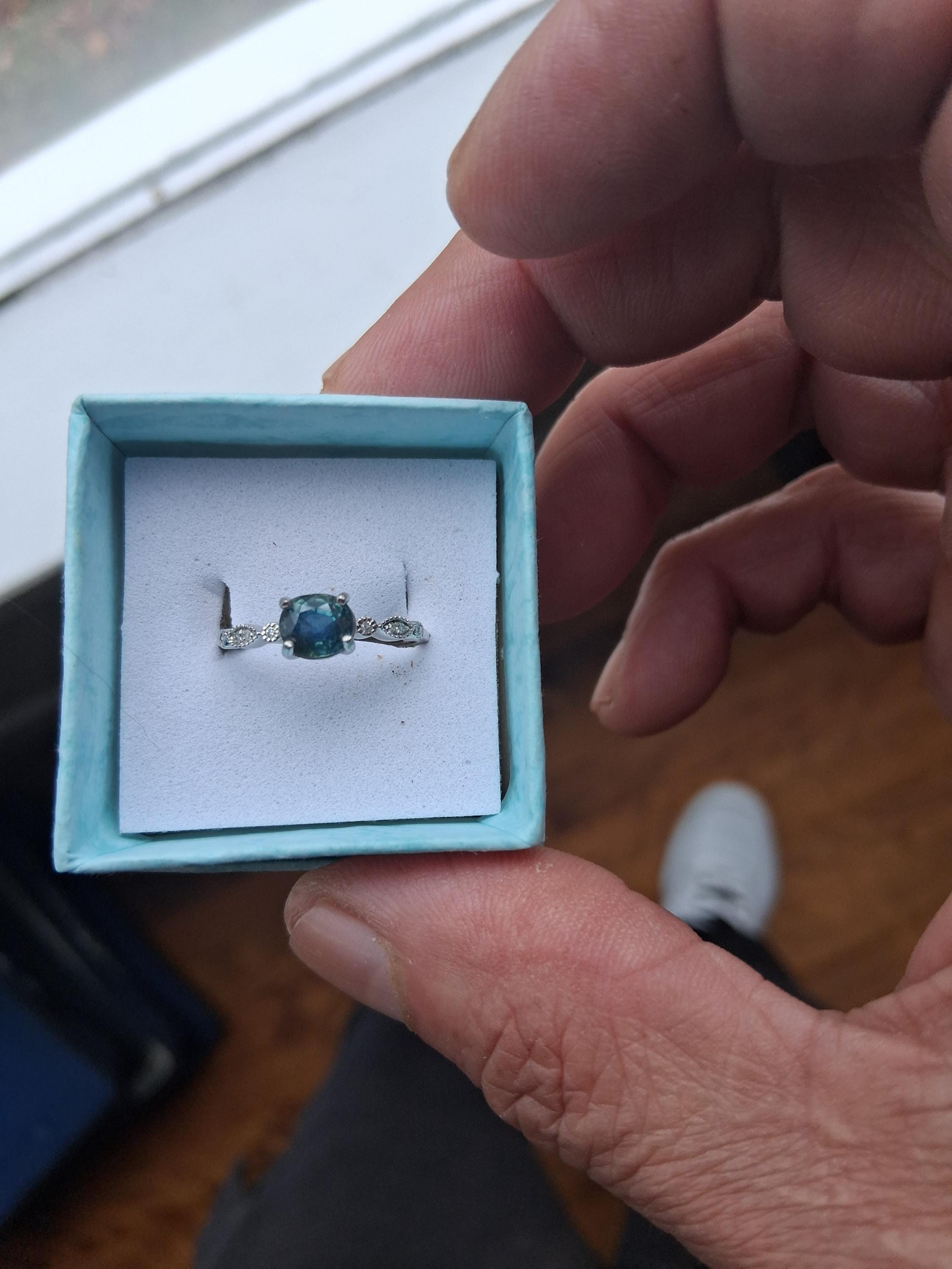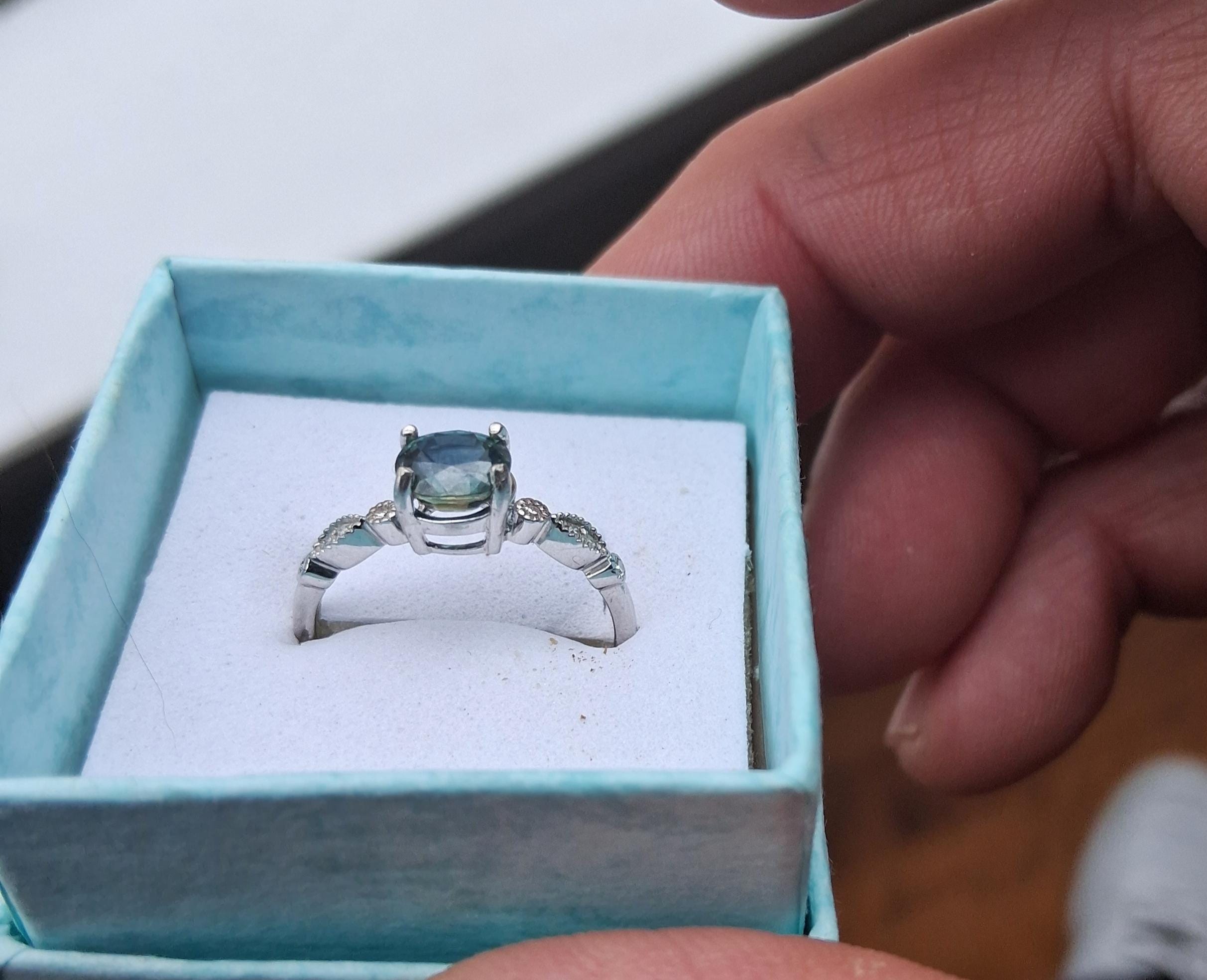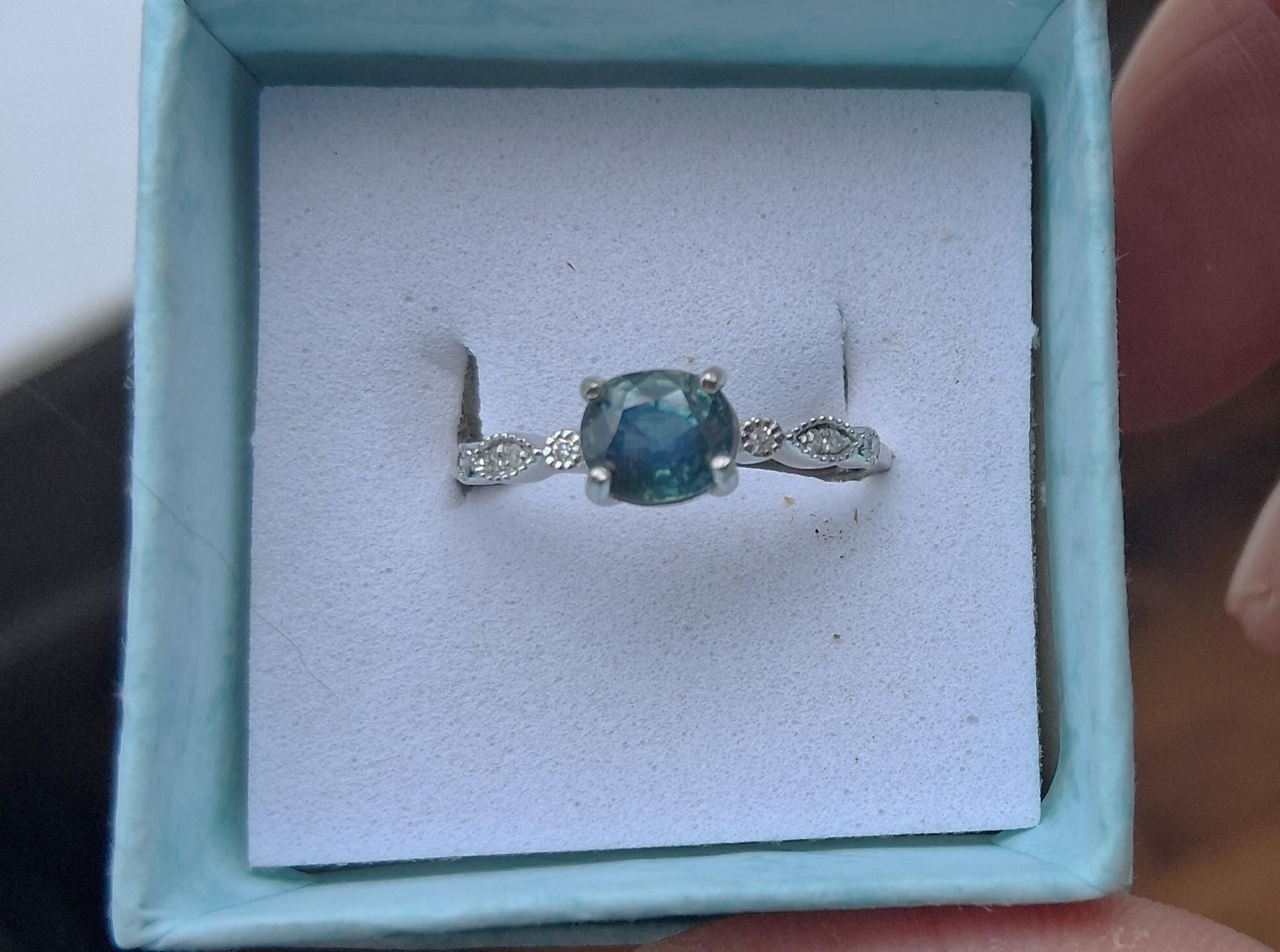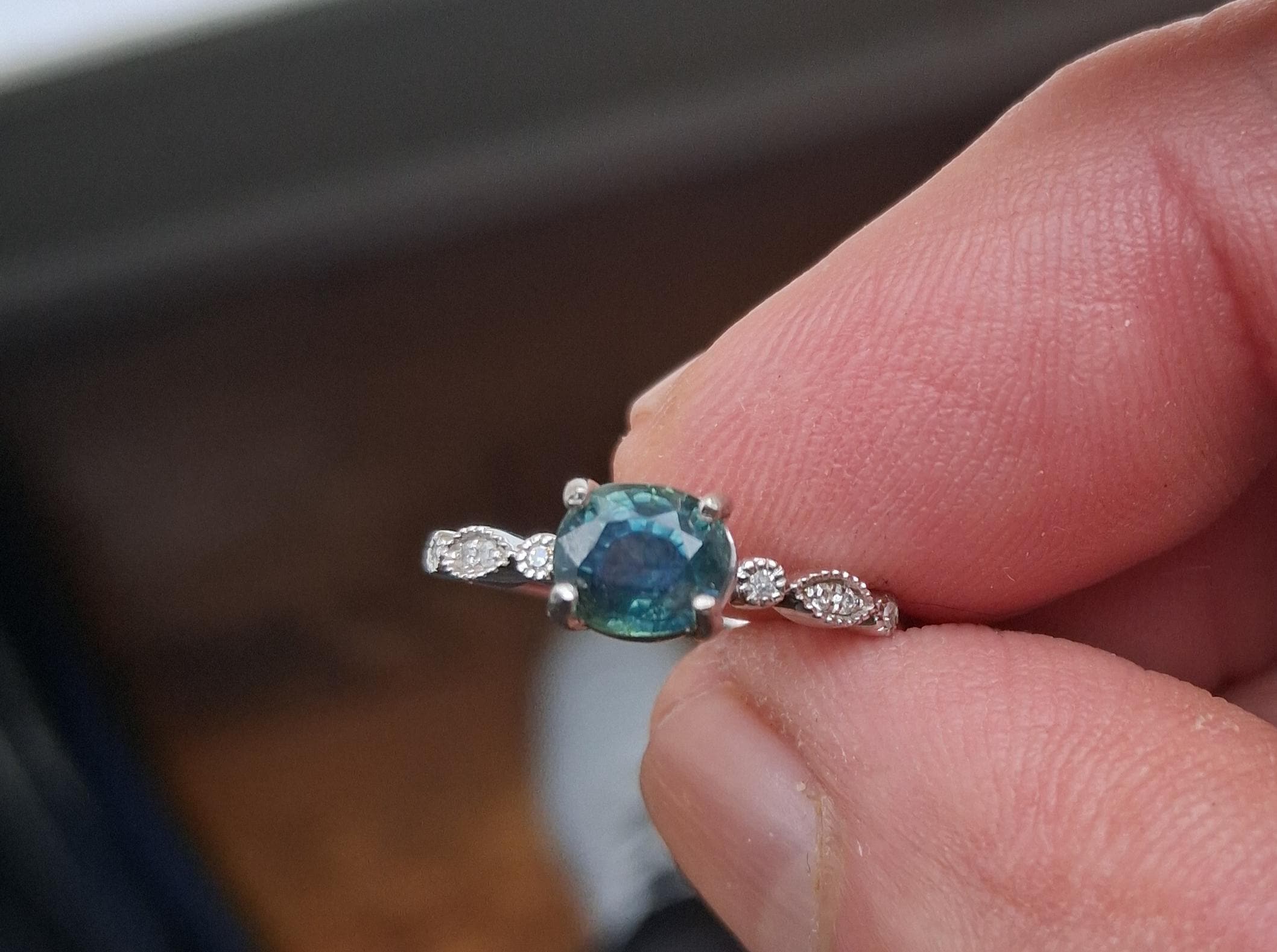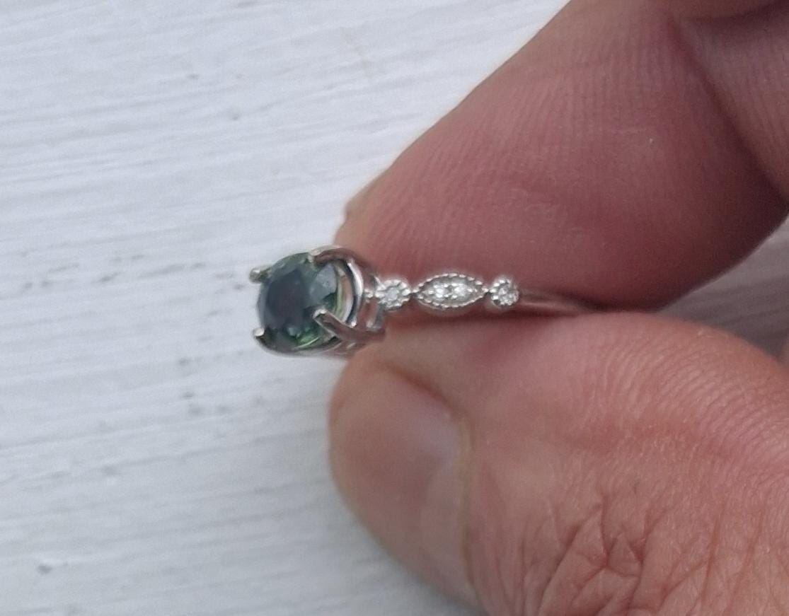 Natural Montana Teal oval sapphire set on white gold , one of a kind jewelry gift for her birthday. Sapphire 6x5.2mm oval shape set into a Ring mount: 10k white gold with Accent diamonds.