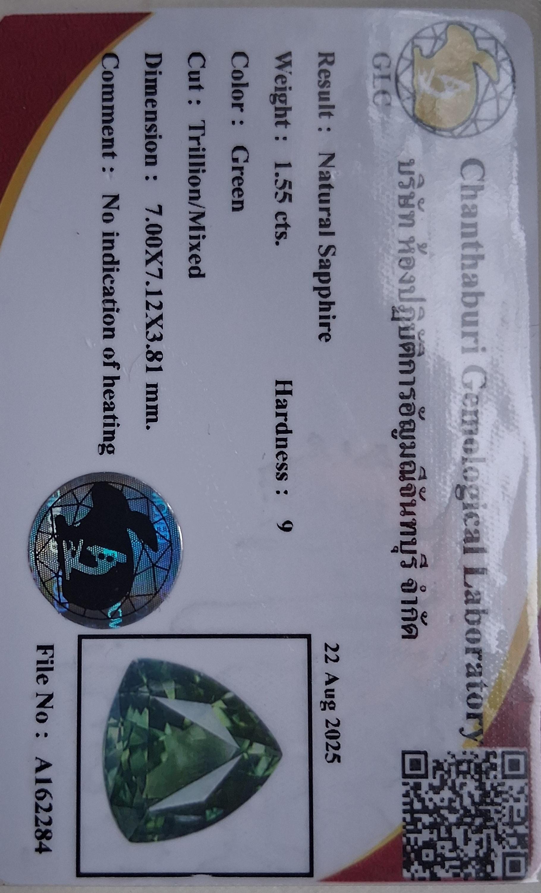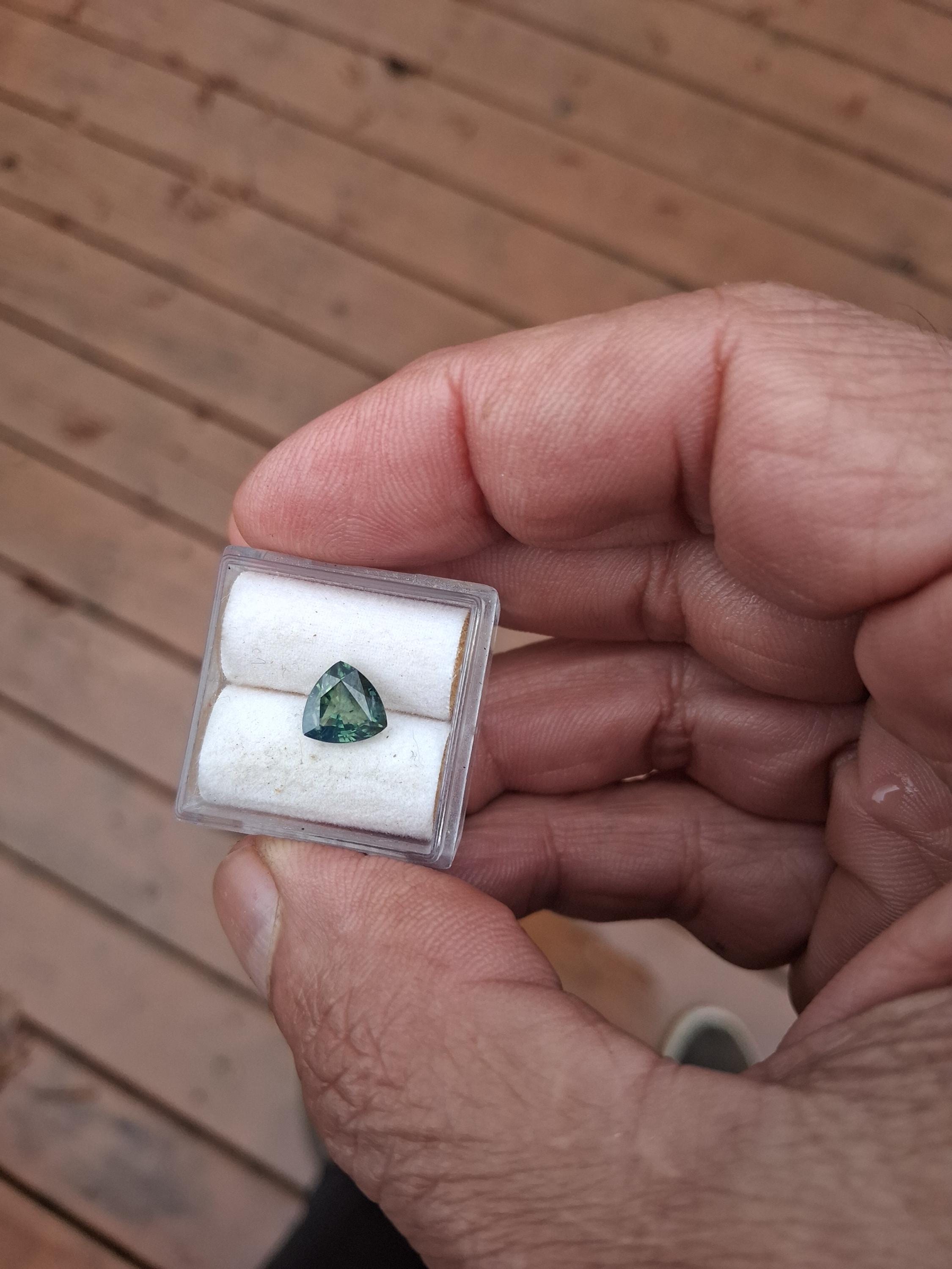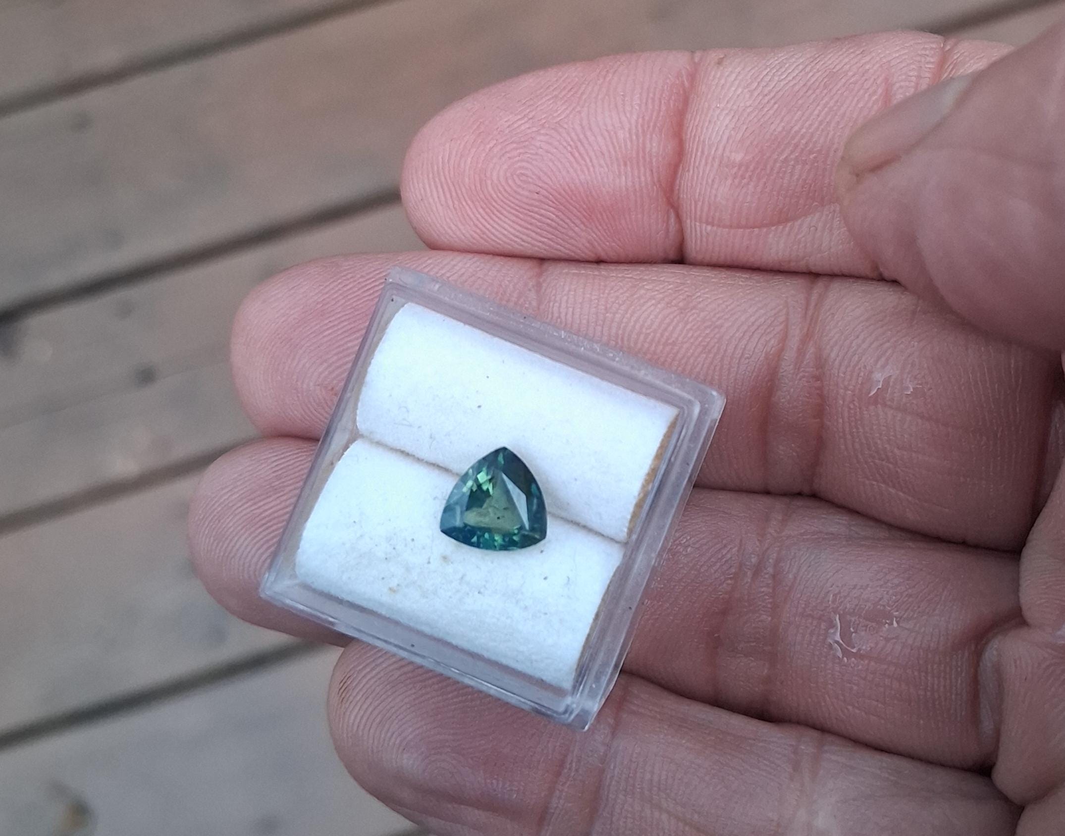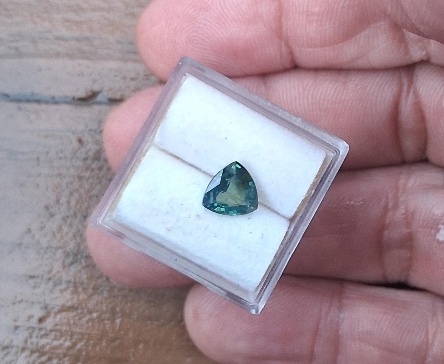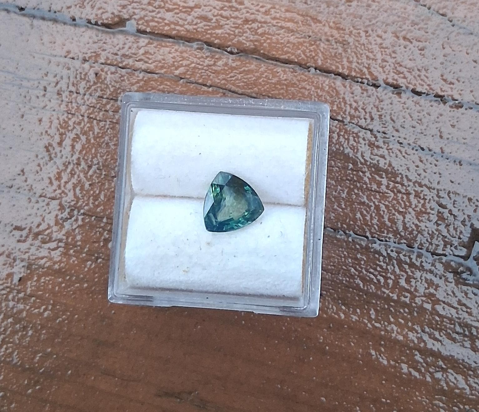 Not heated blue green sapphire triangle shape September gemstone weight: 2.84ct. size: 7 mm triangle, clarity: eye clean. origin: Ceylon. Inventory SBG683