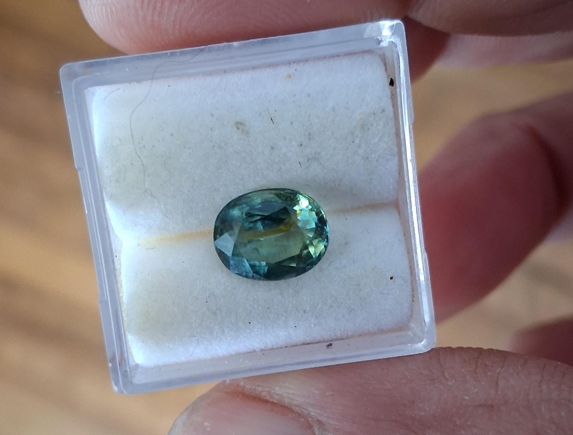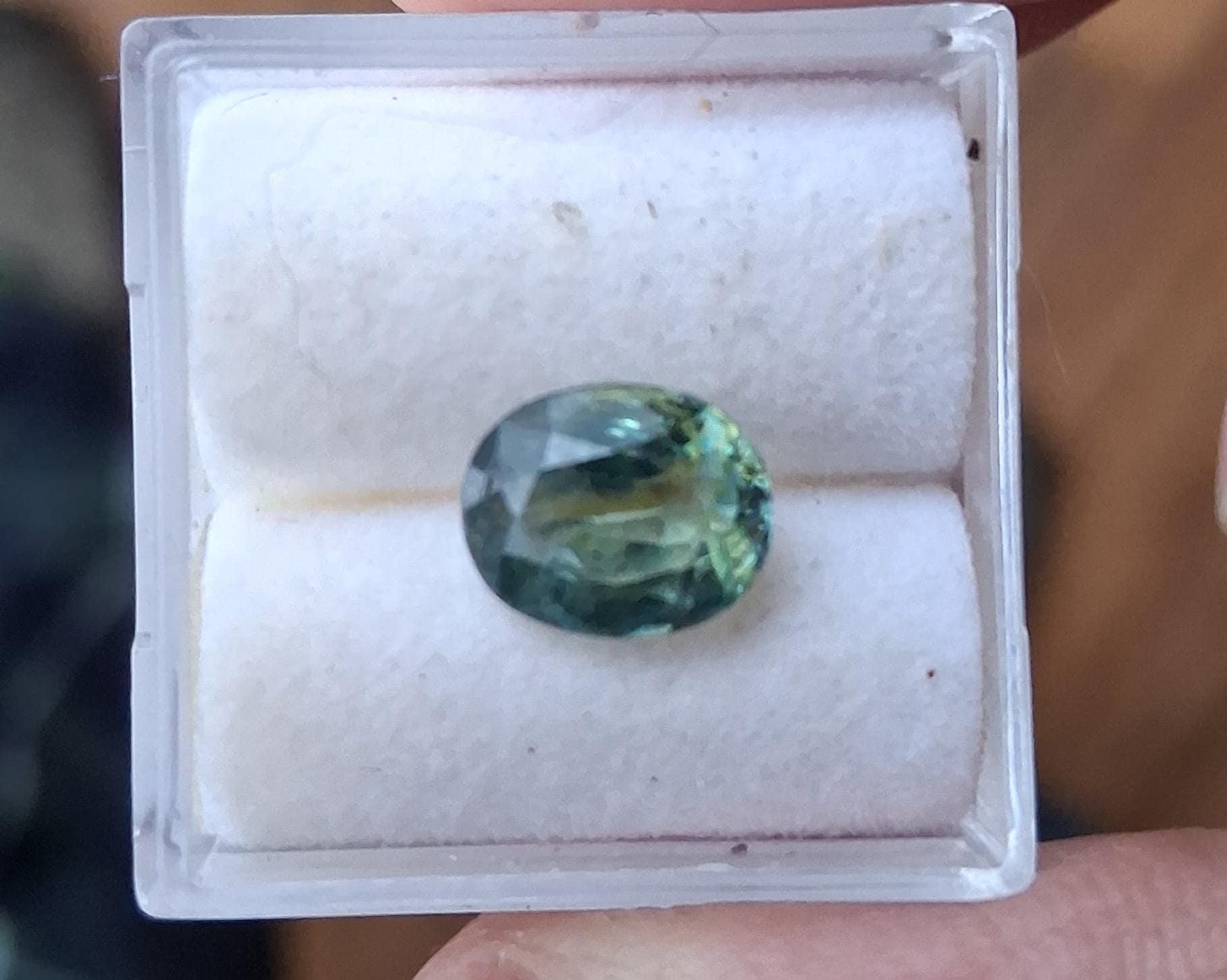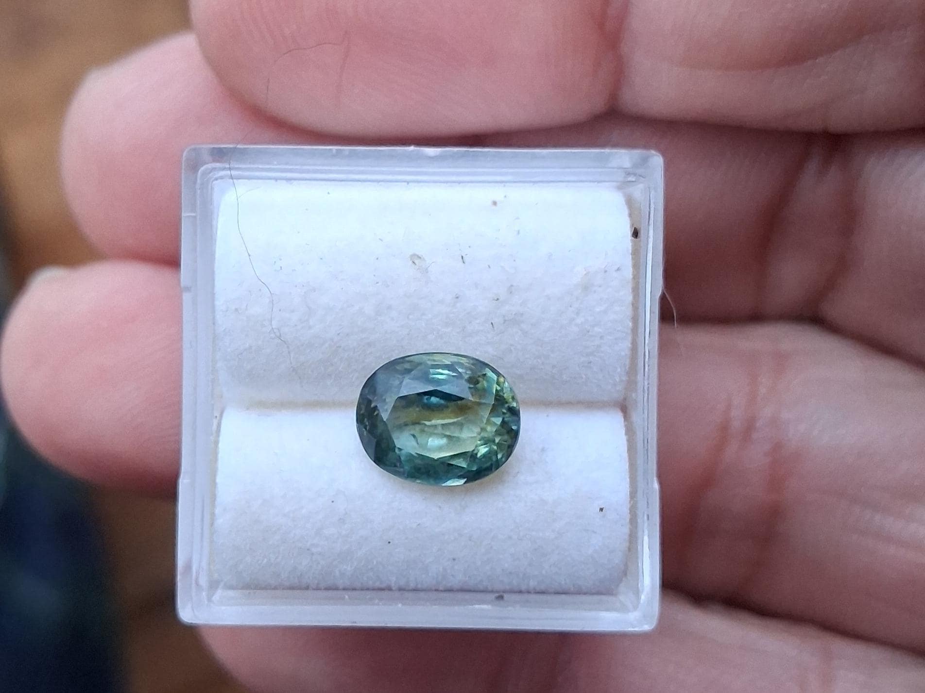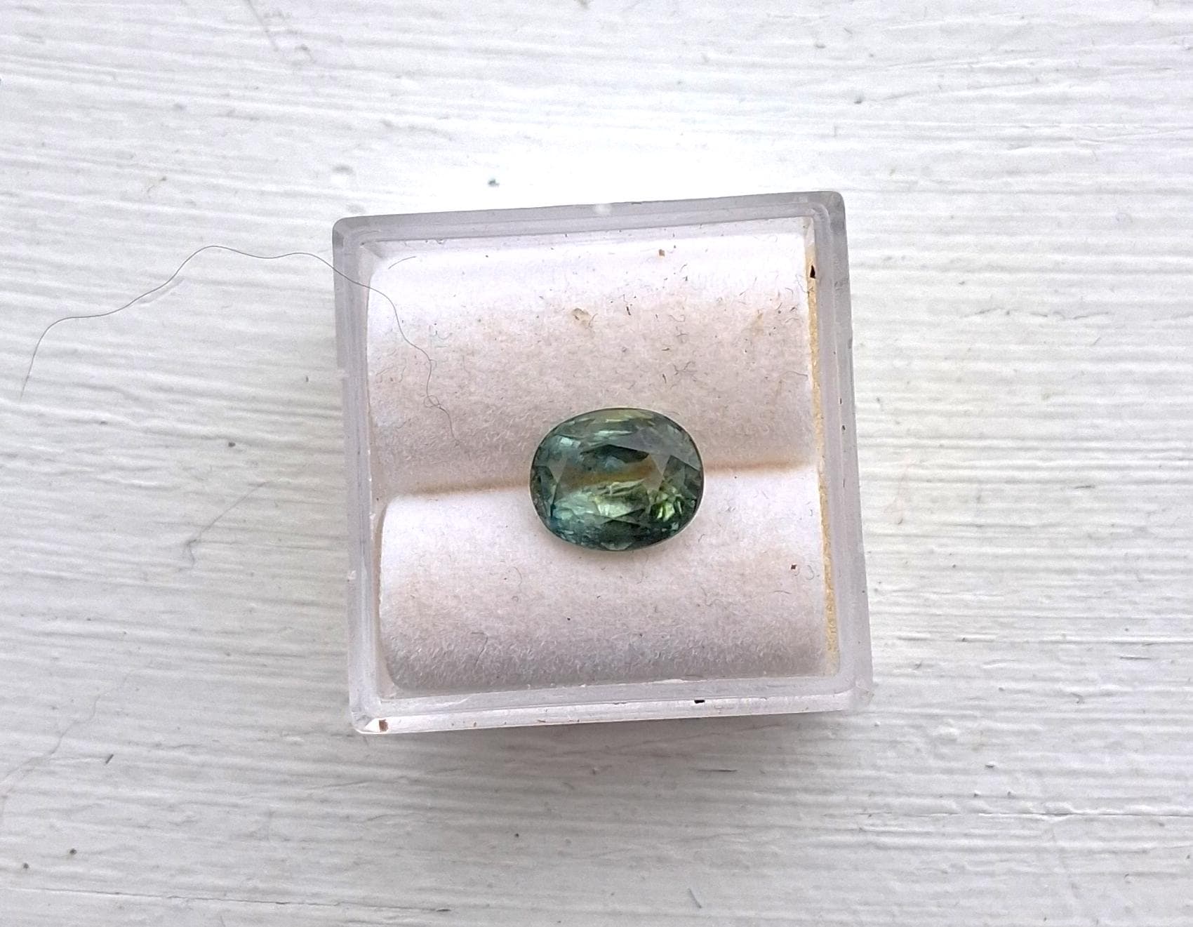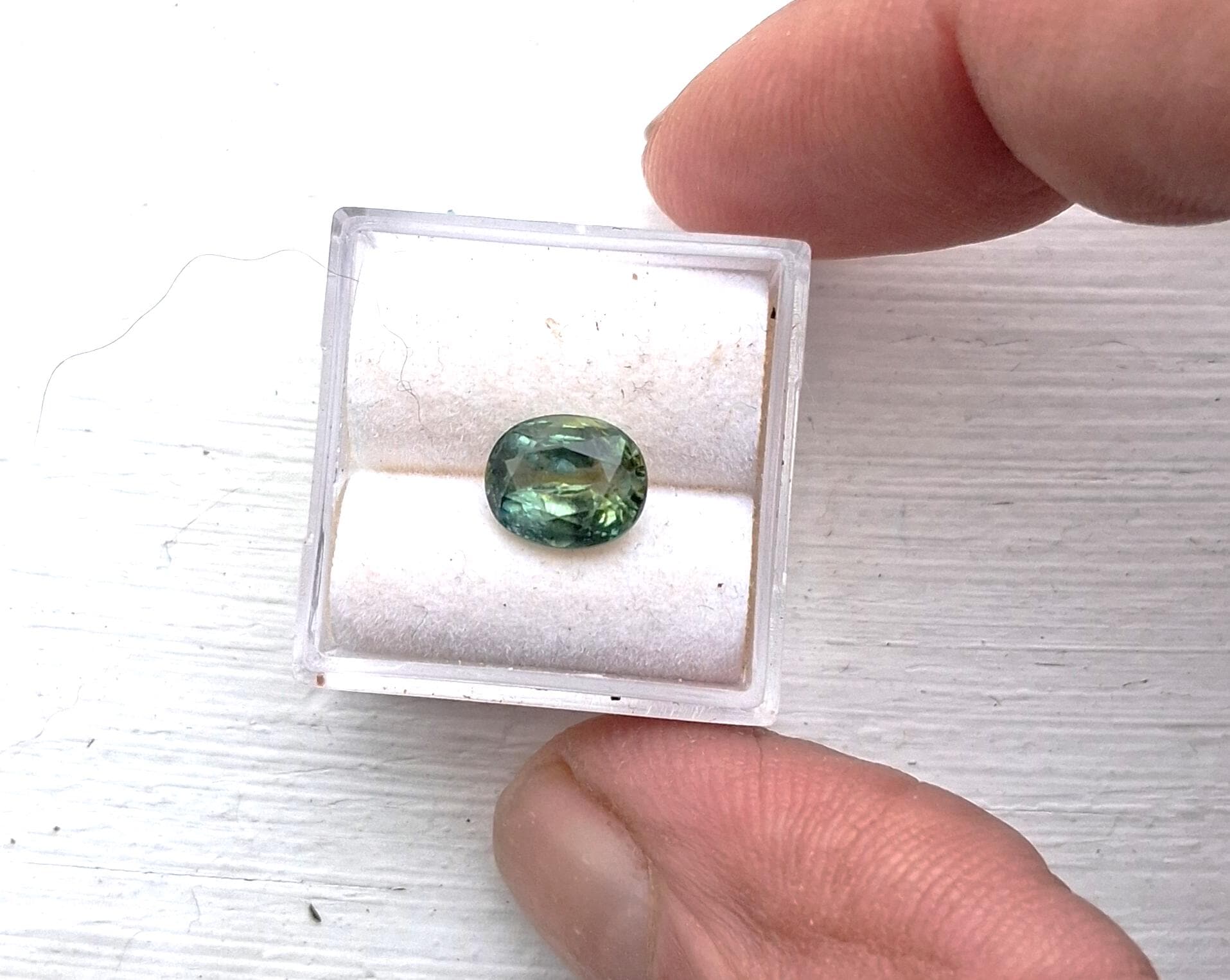 Oval blue green sapphire September birthstone for engagement jewelry. size: 8.3x6.7 mm, weight: 2.09 cts, clarity: eye clean color: medium blue green. origin: Ceylon inventory