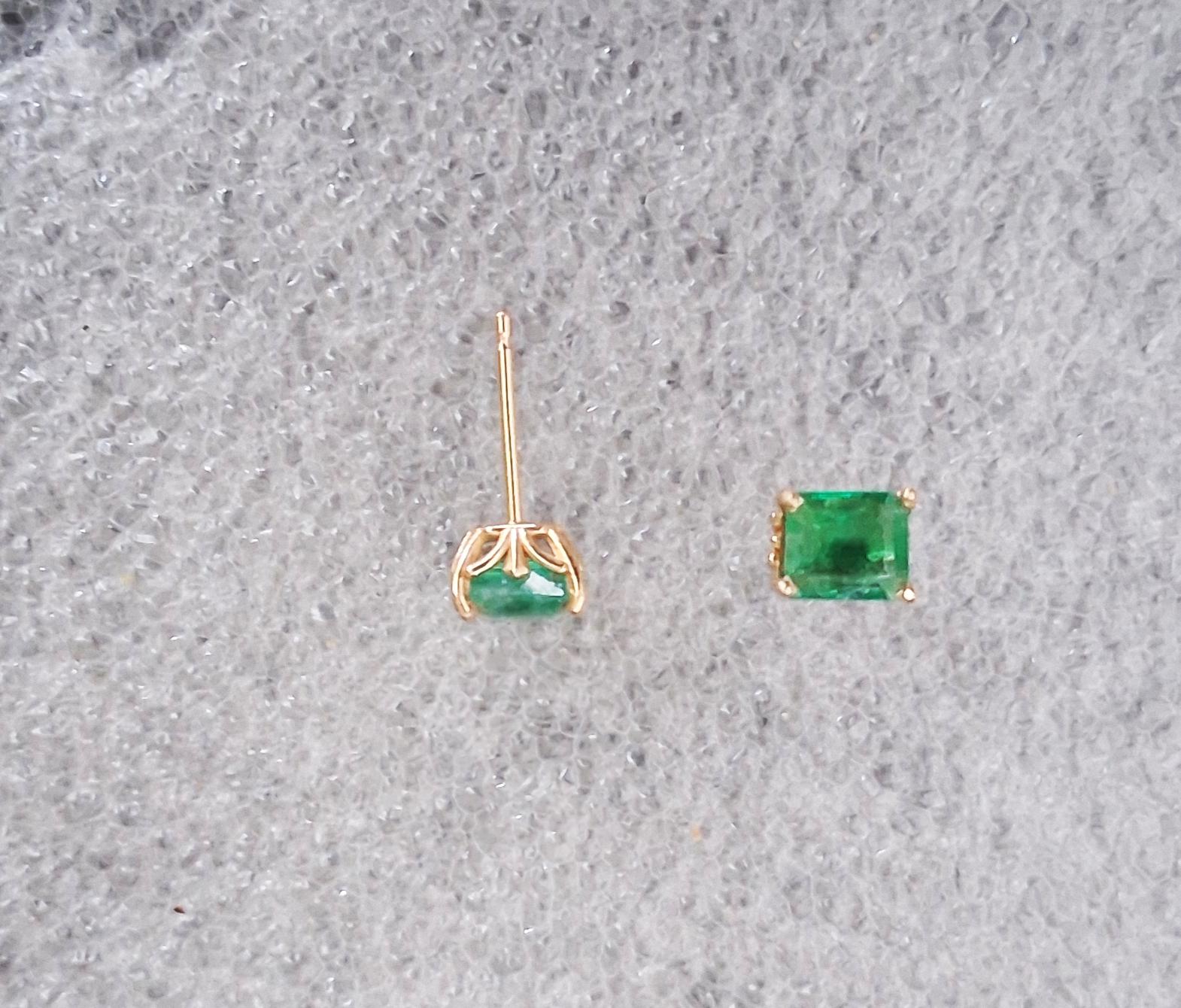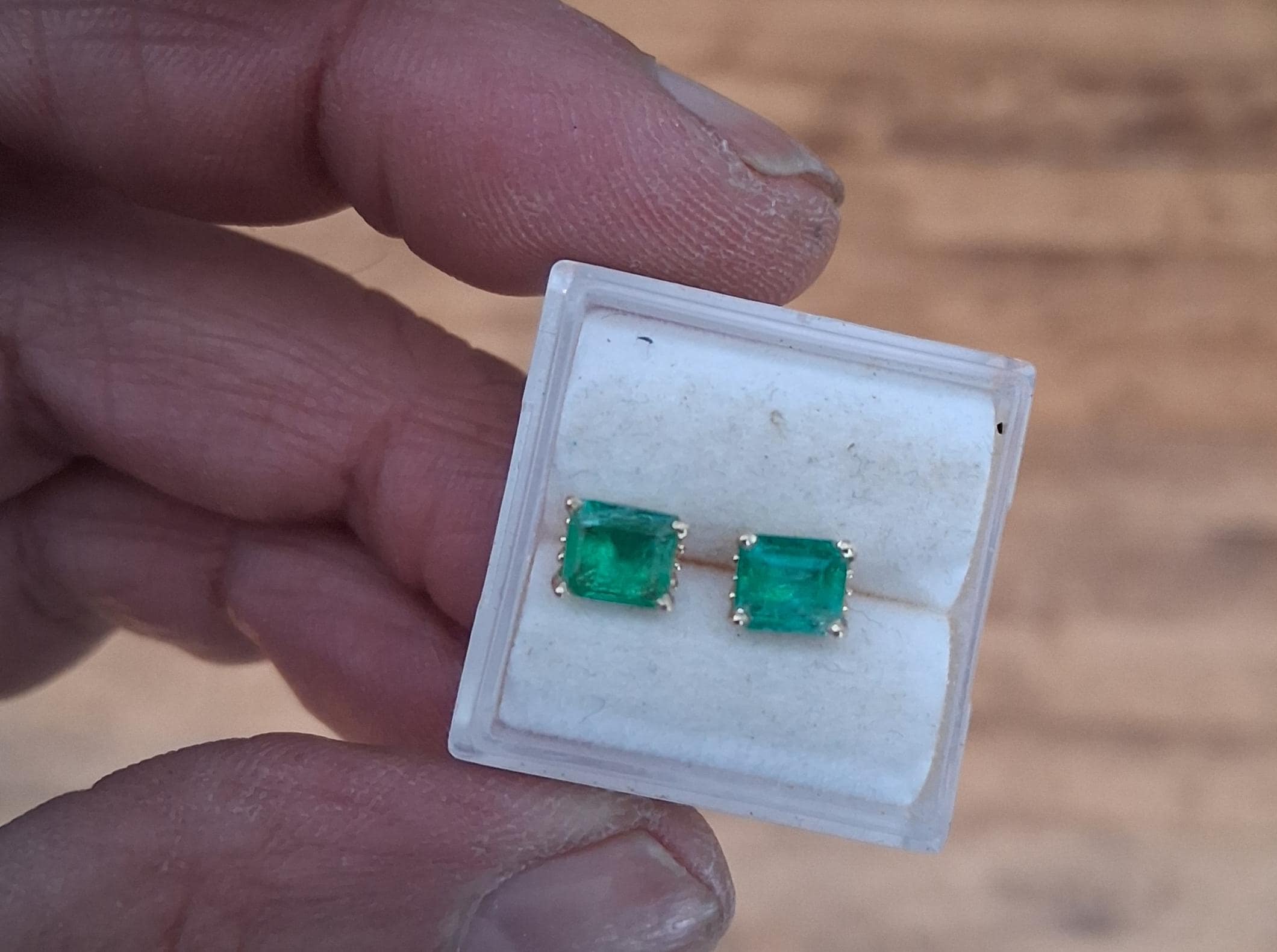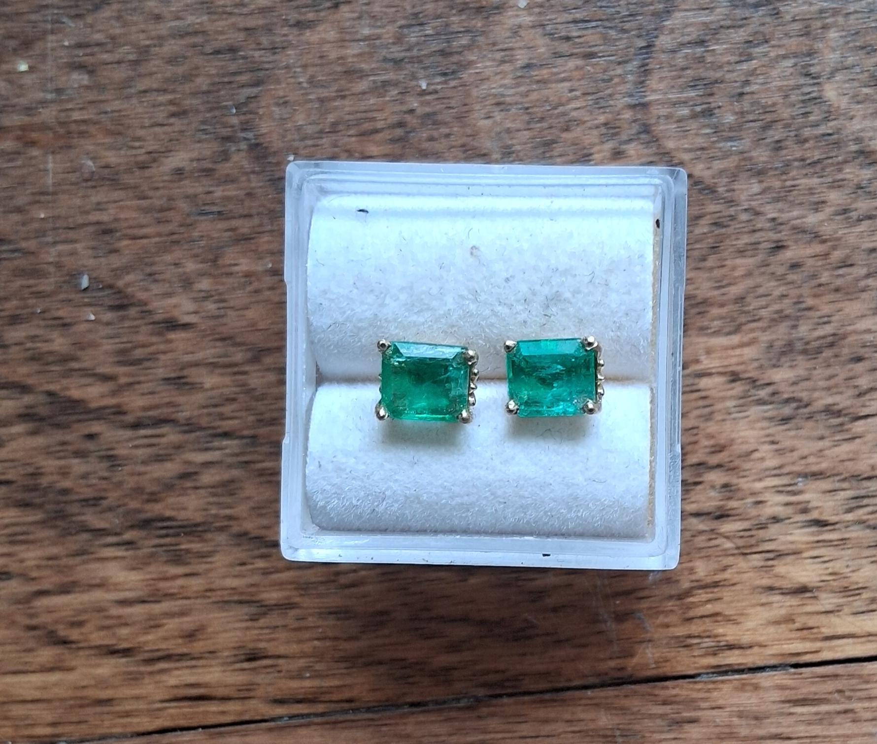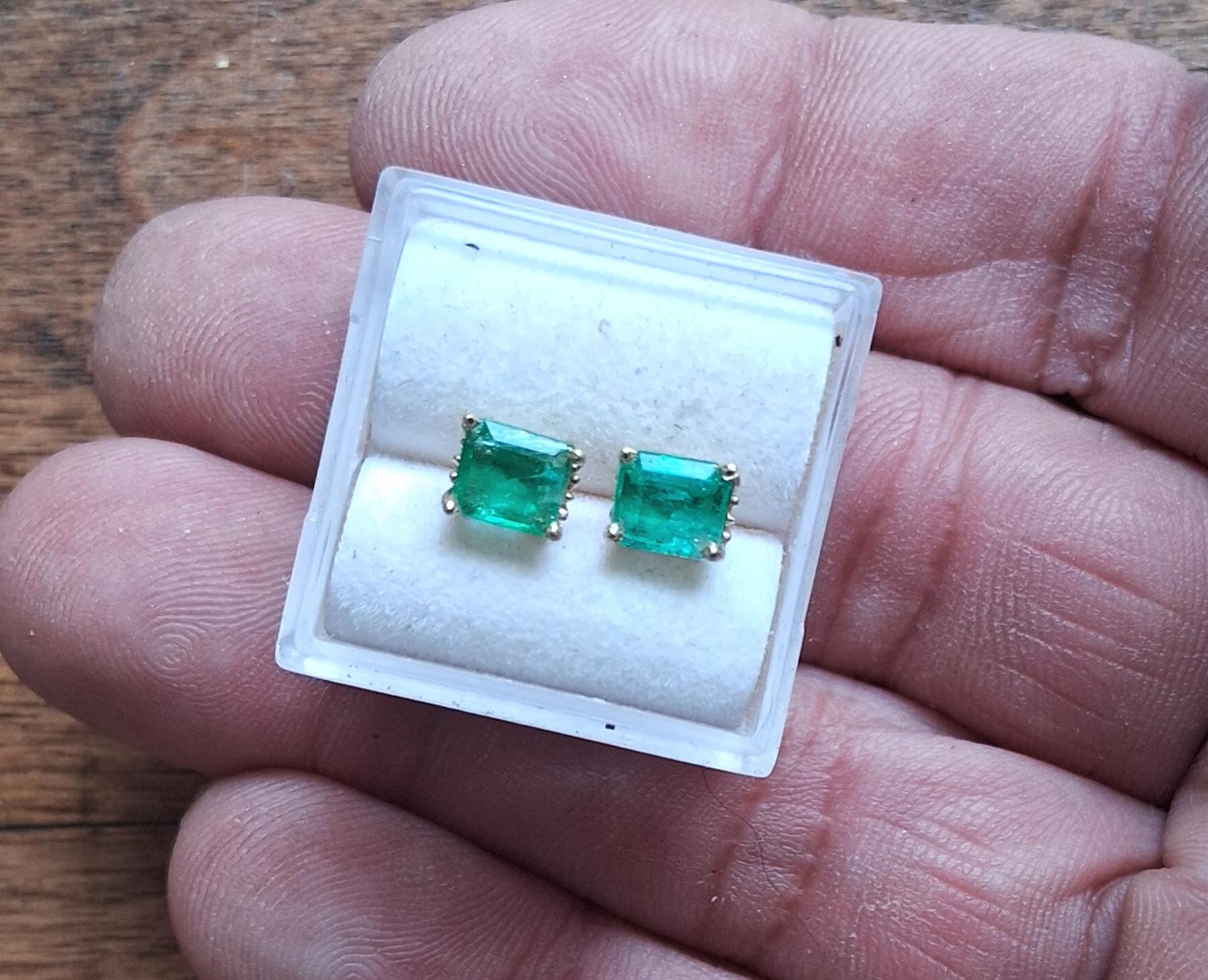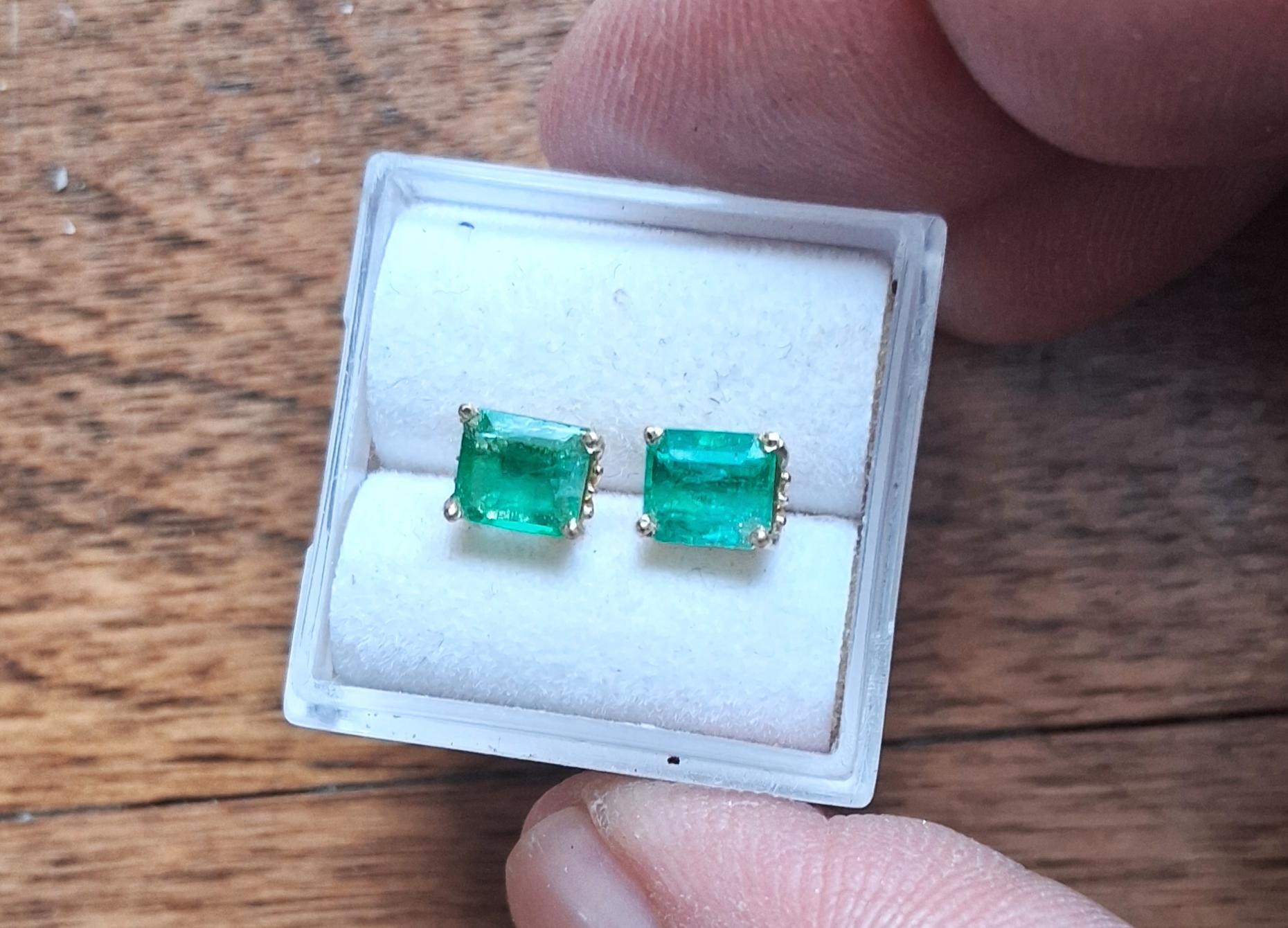 Brazilian emerald yellow gold stud earrings for anniversary jewelry gift , May birthstone. size: 6x4,5mm, clarity: inclusions typical of emeralds. origin : Brazil.