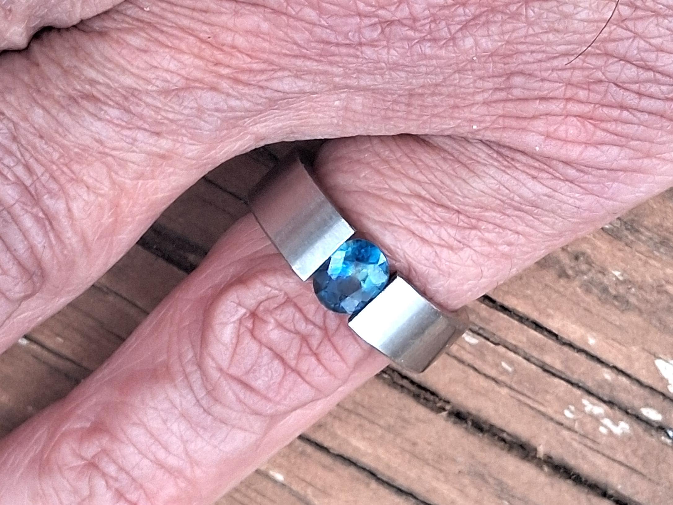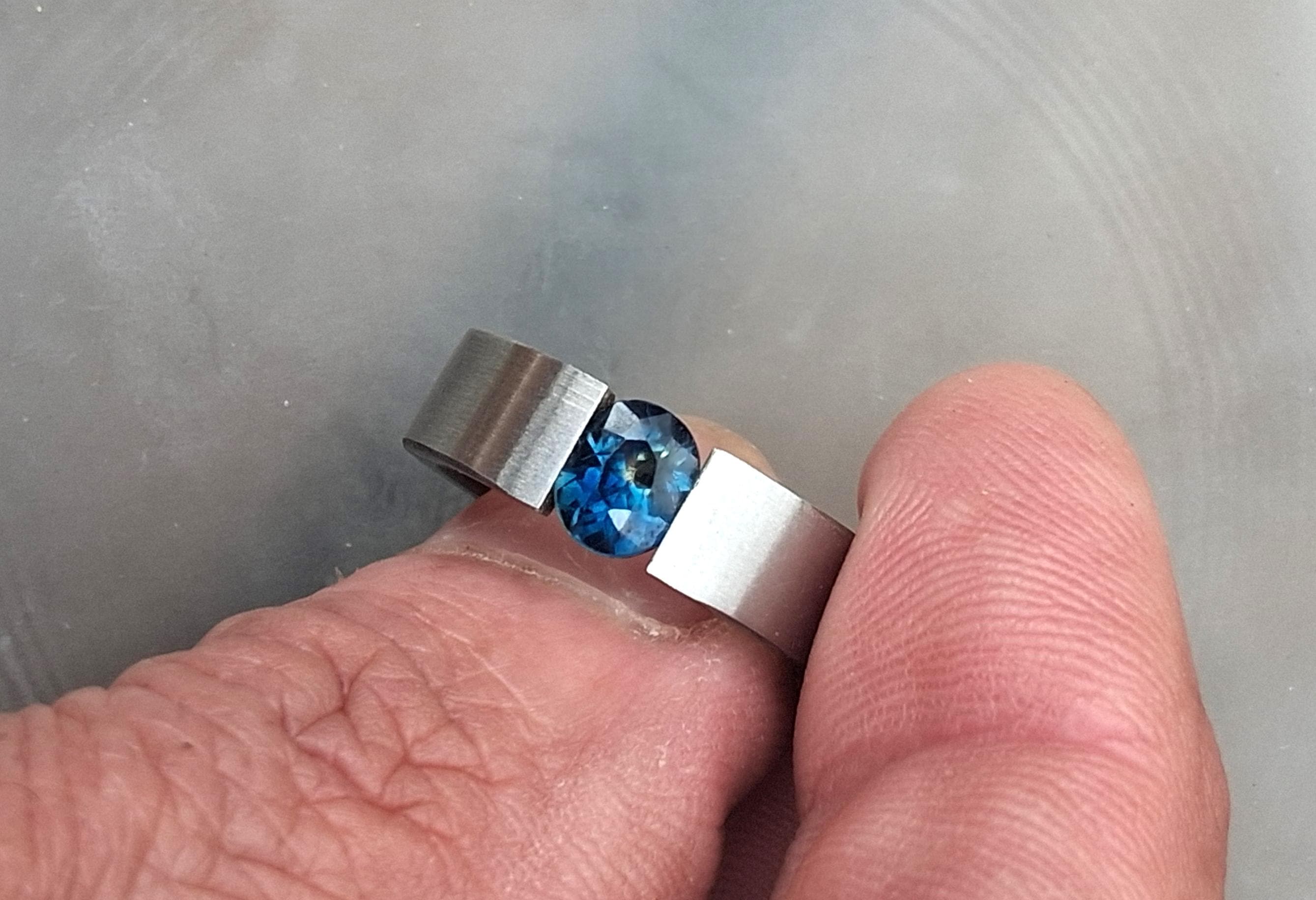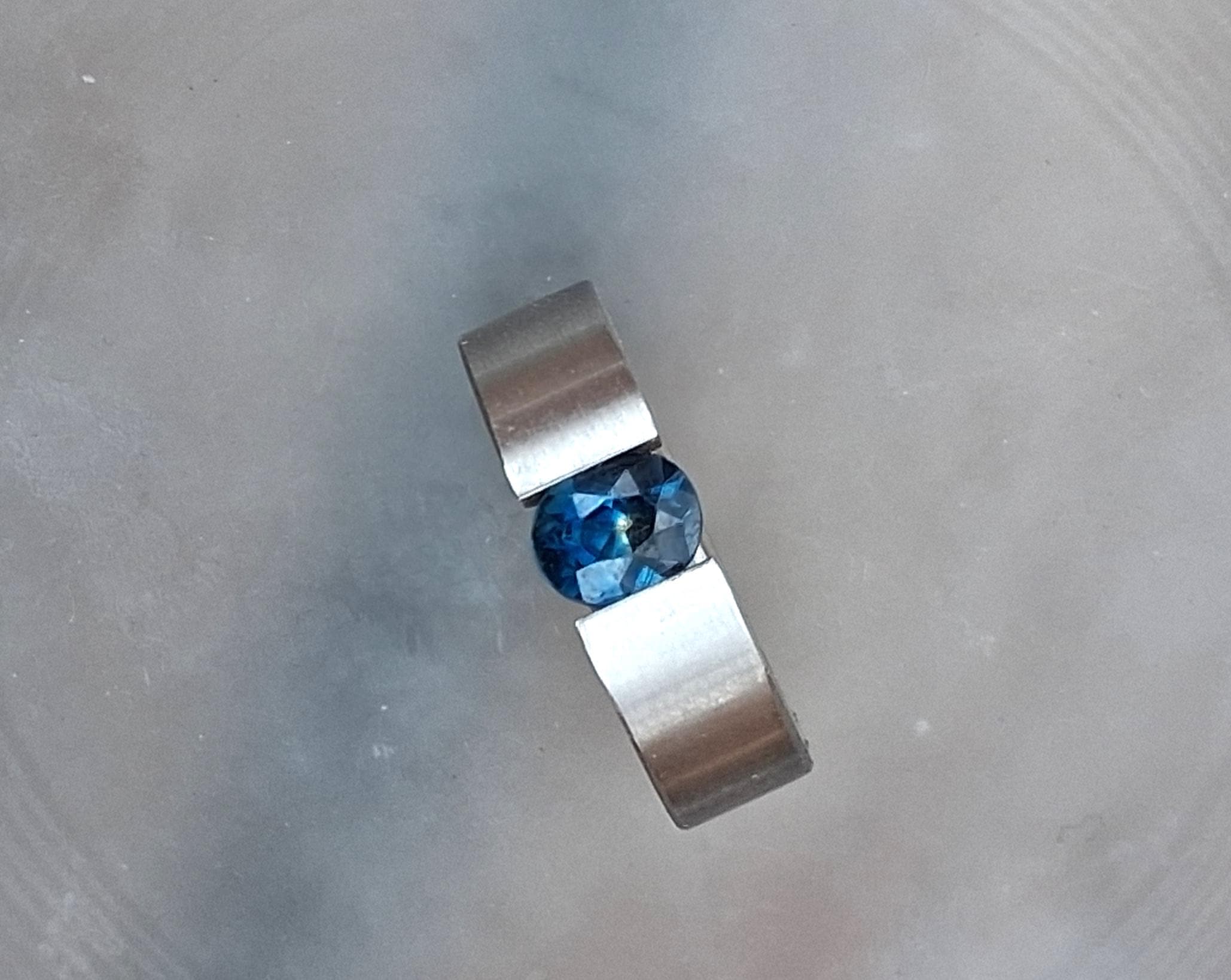 Natural oval Montana blue sapphire stainless steel ring tension setting , September anniversary ring. Finger size 5 3/4US, Sapphire approximate size 7x5mm oval . NOTE: This ring is not sizeable.