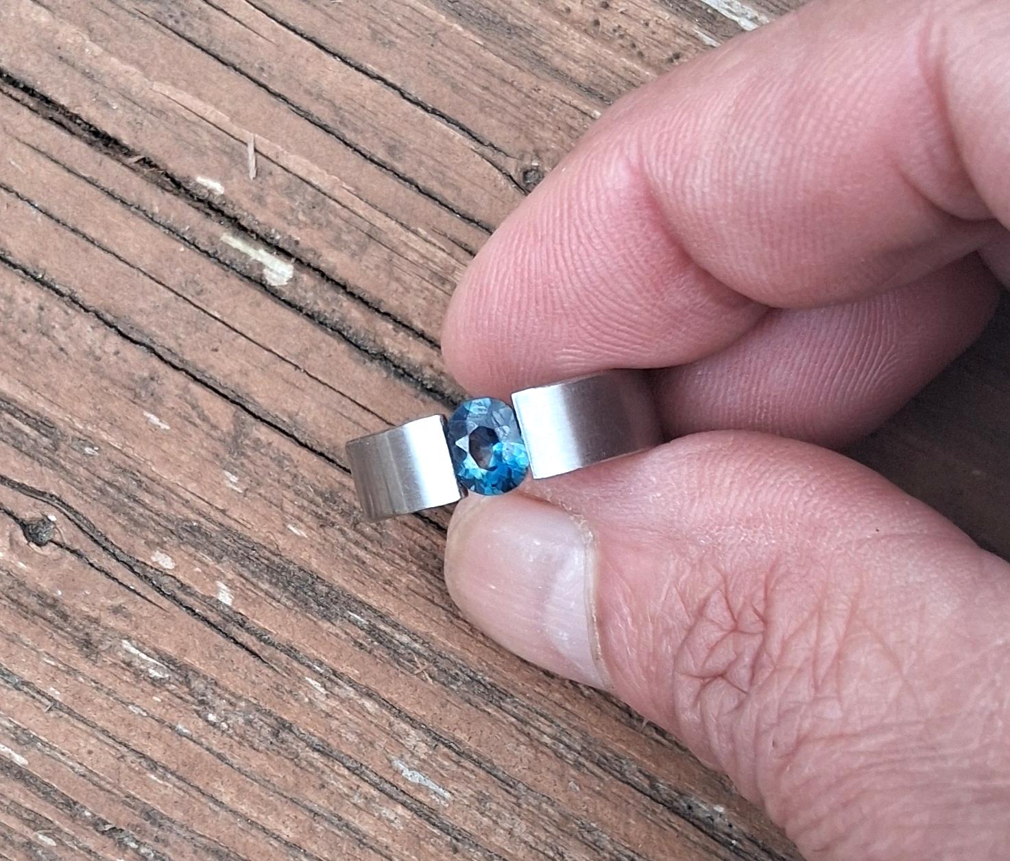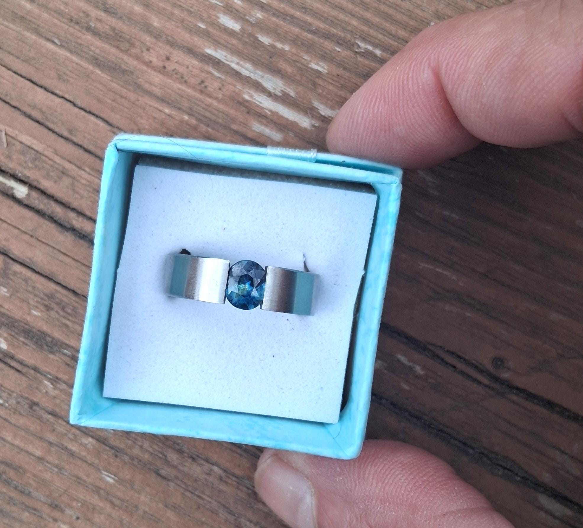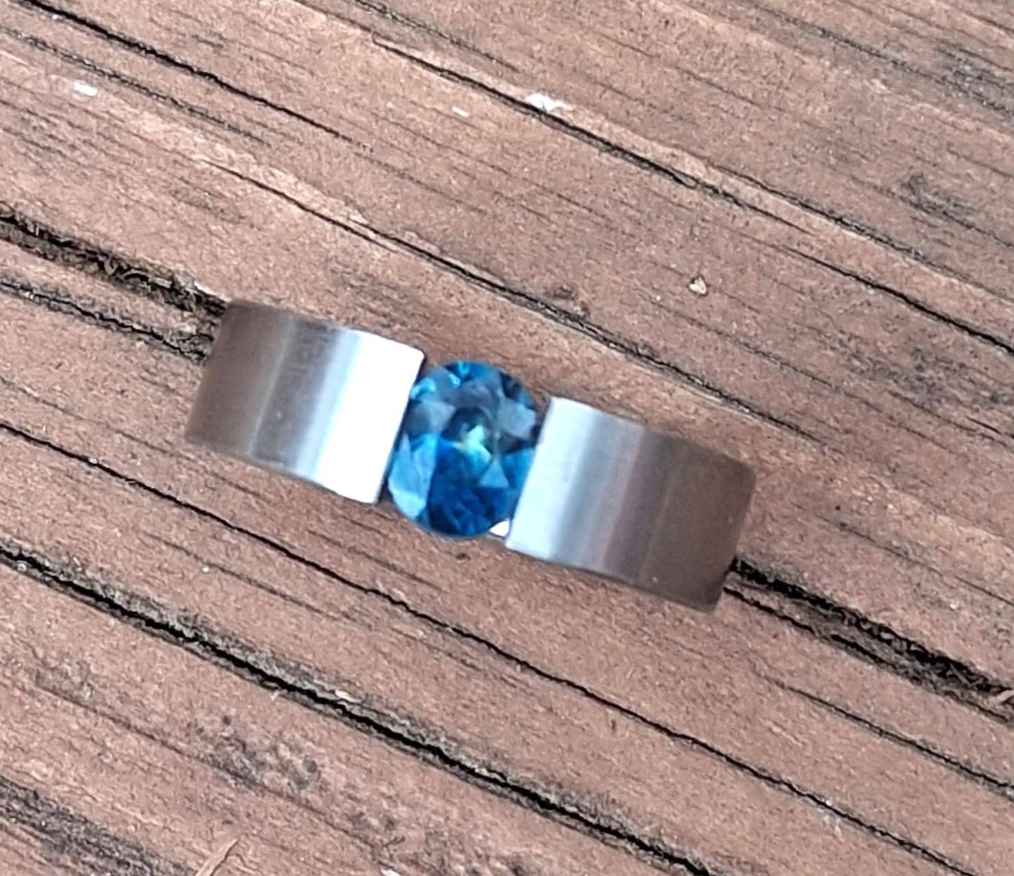 Natural oval Montana blue sapphire stainless steel ring tension setting , September anniversary ring. Finger size 5 3/4US, Sapphire approximate size 7x5mm oval . NOTE: This ring is not sizeable.
