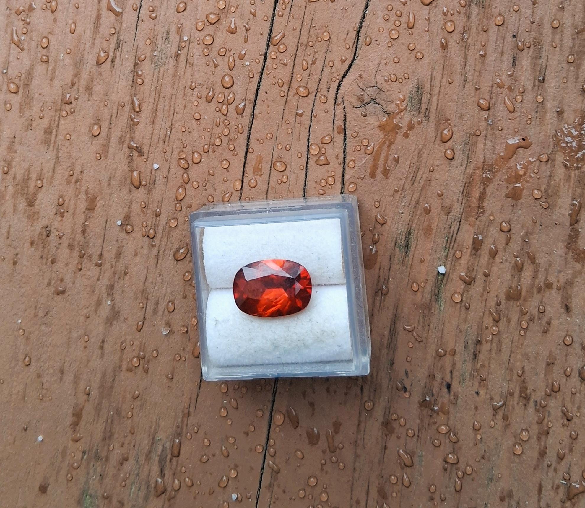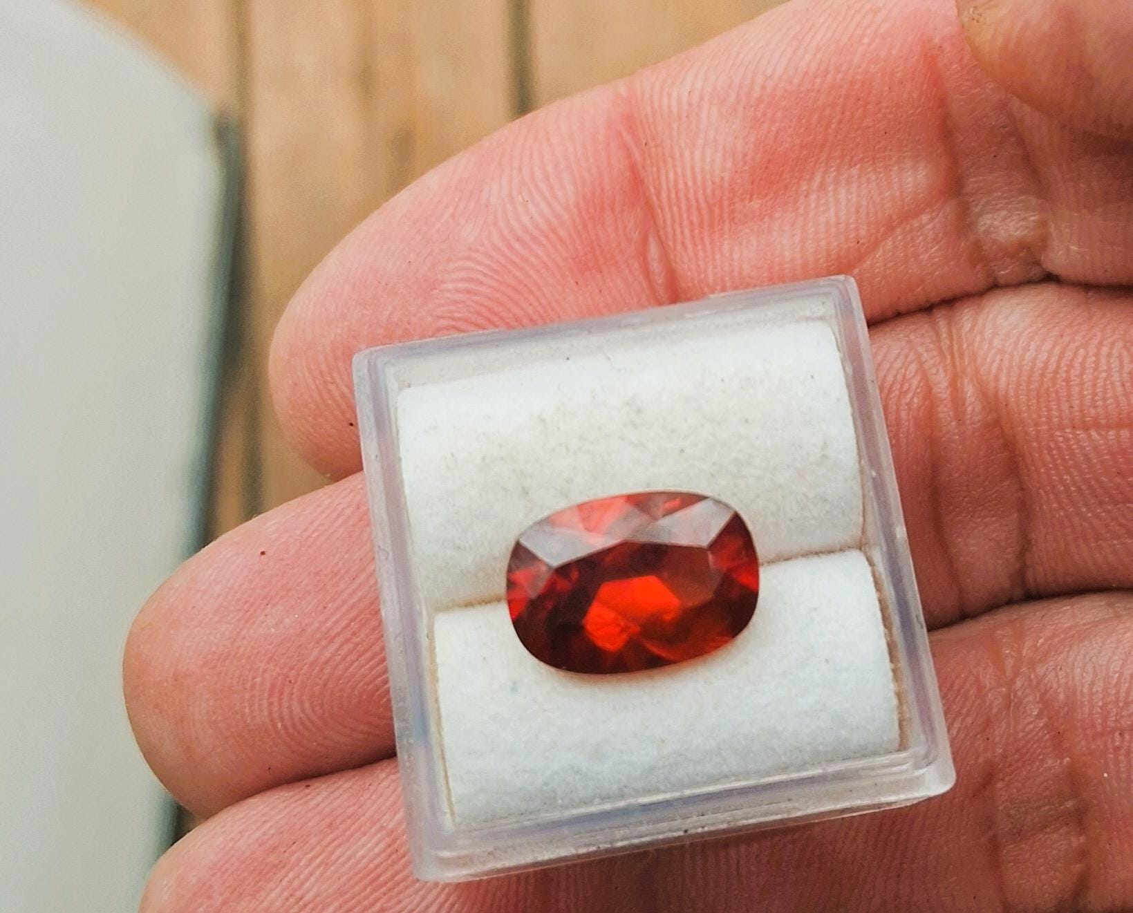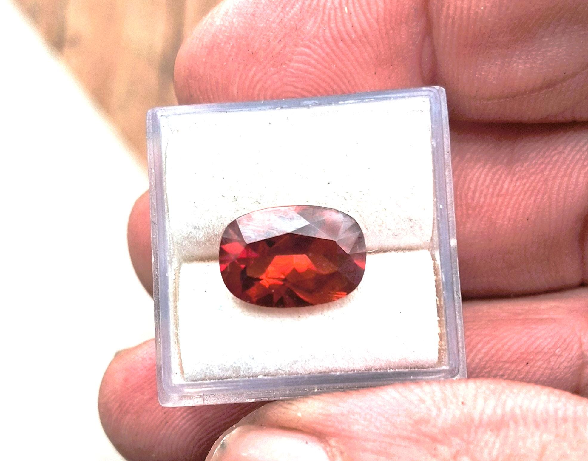 Cushion shape Spessartite garnet January birthstone for anniversary jewelry gift . weight: 3.89cts, size: 11.6x8 mm, origin: Africa, color: red orange . clarity: some minor inclusions typical of this material.