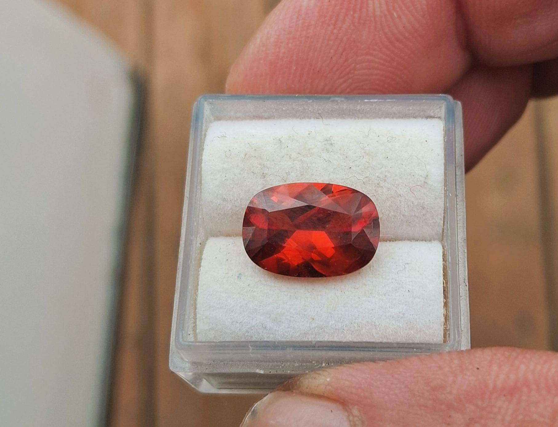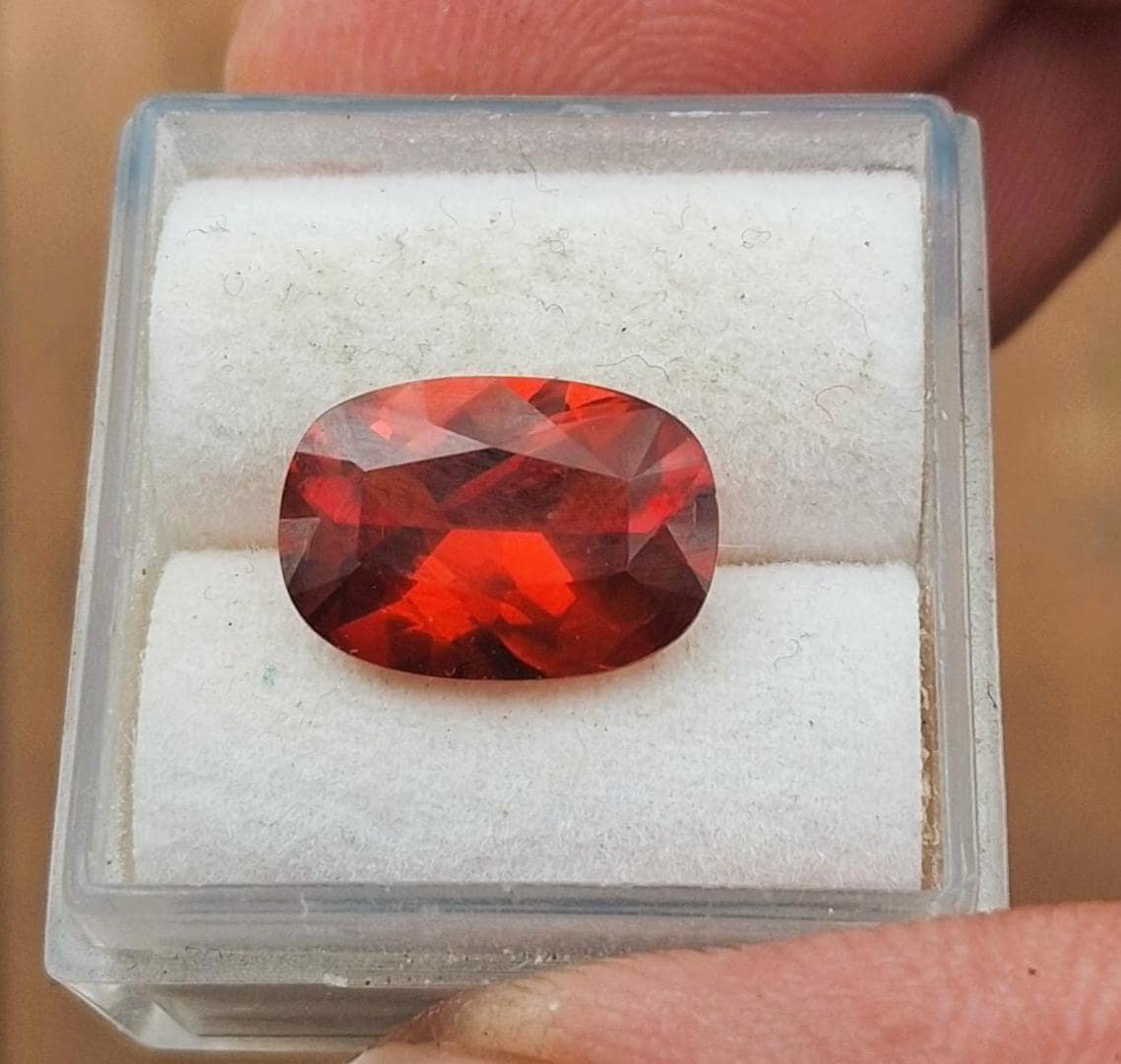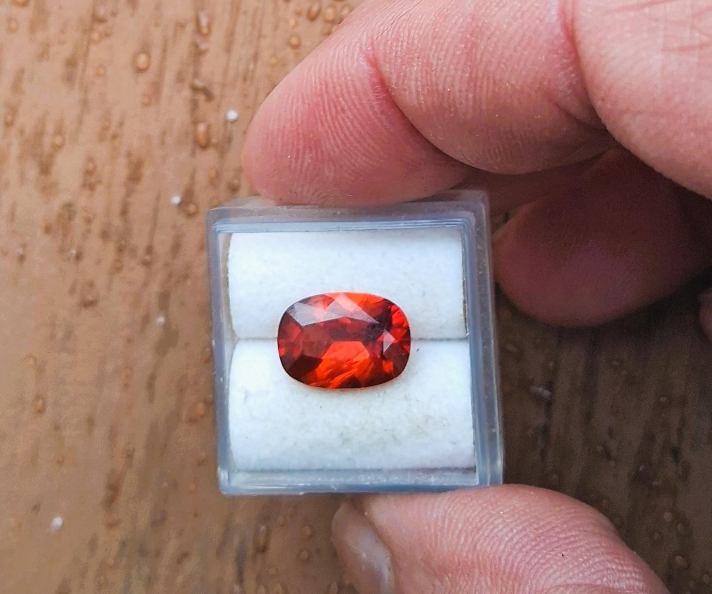 Cushion shape Spessartite garnet January birthstone for anniversary jewelry gift . weight: 3.89cts, size: 11.6x8 mm, origin: Africa, color: red orange . clarity: some minor inclusions typical of this material.