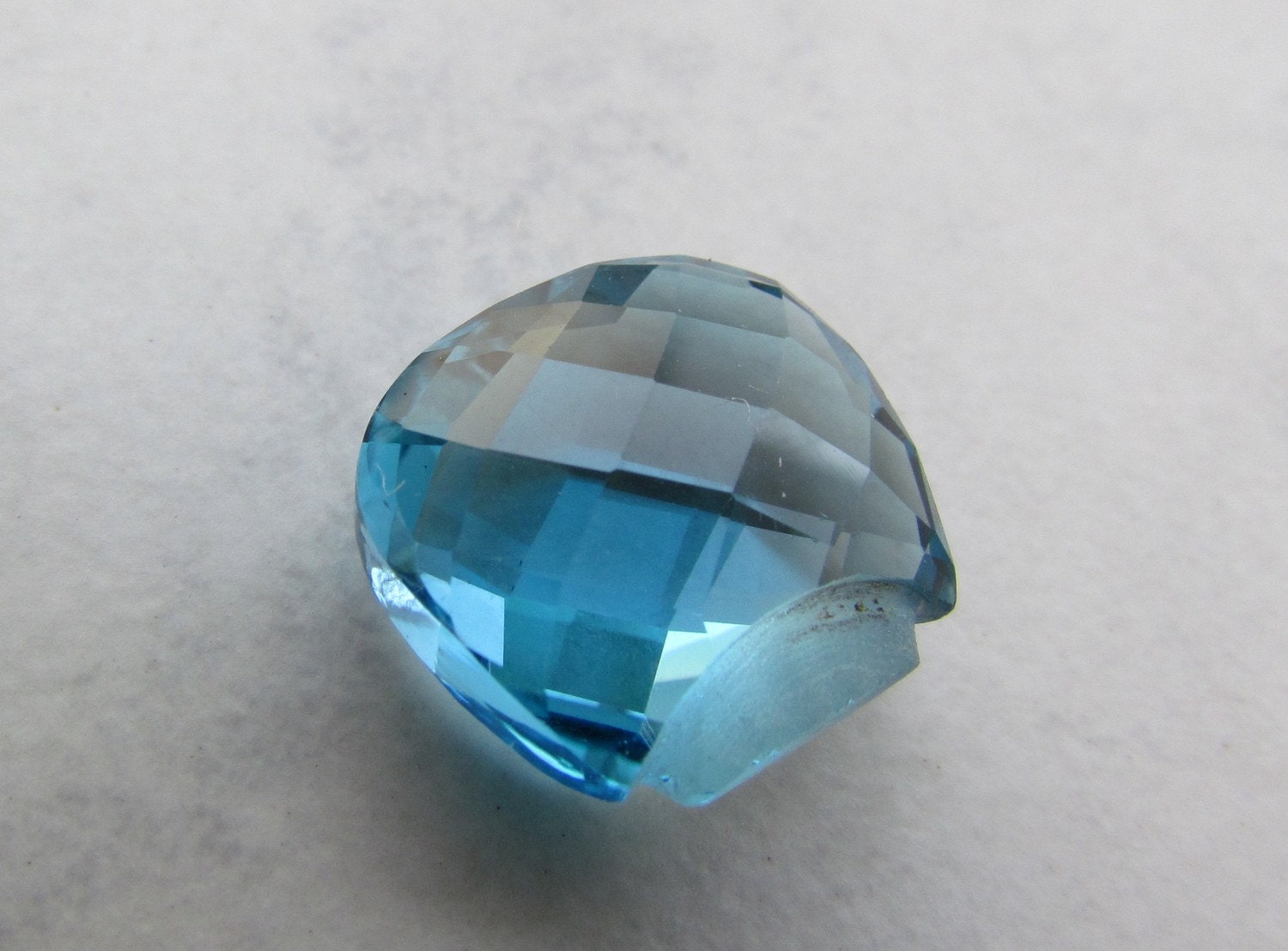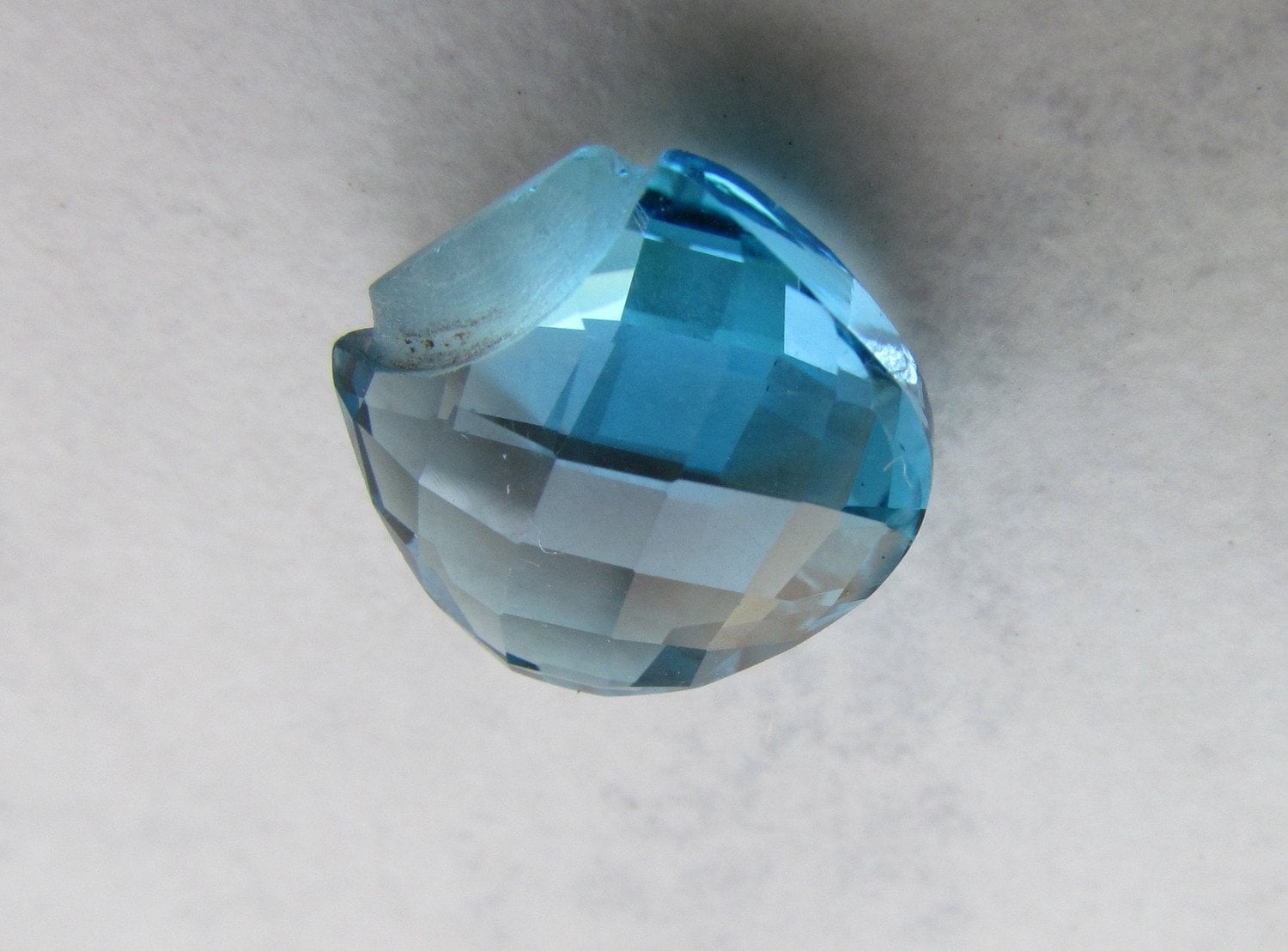 Unique blue topaz cut for a pendant. Square cushion briolette carved insert bail.