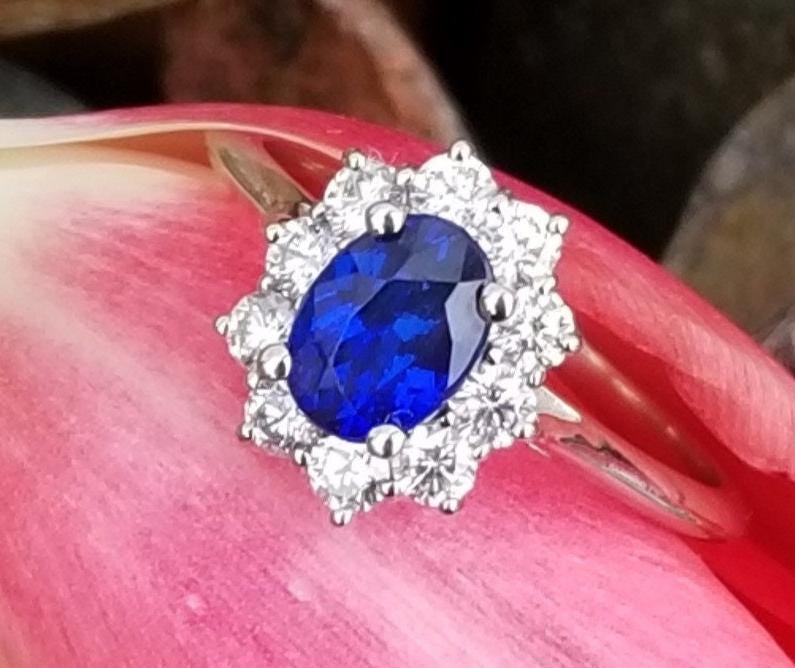 Blue sapphire engagement Diamond cluster ring for wedding anniversary gift for her Main stone: Rich blue natural sapphire 6.7 x 4.9mm oval, 1.10cts, eye clean. Minor inclusions under magnification, but not noticeable to the naked eye.